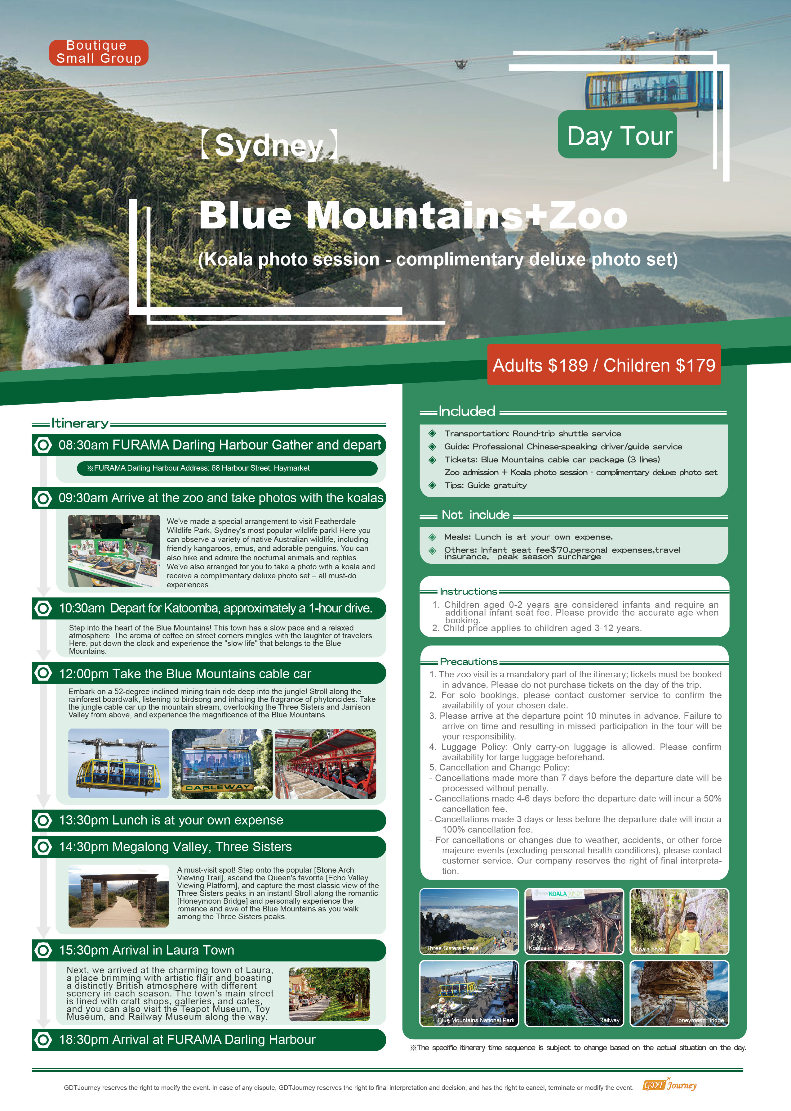 08:30 Depart from Furama Darling Harbour Furama Darling Harbour: 68 Harbour St, Haymarket, Sydney NSW 2000 (Next to the former Holiday Inn) 09:30 Arrive at the Zoo & Koala Photo Session Special arrangement to enter 【Featherdale Wildlife Park】, Sydney's most popular wildlife park! Observe a variety of native Australian wildlife, see friendly wallabies, cassowaries, and adorable little penguins. You can also walk through to view subterranean nocturnal and reptile exhibits. We have specially arranged a koala photo opportunity for you, including a complimentary deluxe printed photo set – an essential experience. 10:30 Depart for Katoomba, approx. 1-hour drive Step into the heart of the Blue Mountains! This town has a slow pace and a relaxed atmosphere, with the scent of coffee from corner cafes mingling with the laughter of travelers. Here, forget about time and experience the 'slow life' of the Blue Mountains. 12:00 Ride the Three Blue Mountains Cableways, Forest Walk, Jamison Valley Begin by riding the 52-degree incline Scenic Railway, plunging into the depths of the forest! Stroll along the rainforest boardwalk, listening to birdsong and inhaling the phytoncides. Board the Scenic Cableway, ascending along the cliff face, overlooking the Three Sisters and Jamison Valley from above, experiencing the grandeur of the Blue Mountains. 13:30 Lunch on your own 14:30 Megalong Valley, Boar's Head Rock, Honeymoon Bridge, Three Sisters A must-visit! Walk the popular 【Cliff Top Walking Track (via Stone Arch)】, ascend to the Queen's favored 【Echo Point Lookout】, instantly capturing the most classic view of the Three Sisters! Stroll along the romantic 【Honeymoon Bridge】, walking right up to the Three Sisters to feel the romance and awe of the Blue Mountains. 15:30 Arrive in Leura Village Next, we arrive at the artistic Leura Village, which has a strong English charm and different scenery in every season. The main street is lined with craft shops, galleries, and cafes. You can also take the opportunity to visit the Teapot Museum, Toy Museum, or Railway Museum. 18:30 Arrive back at Furama Darling Harbour, tour concludes *The above times and route are for reference only. Please refer to the actual situation on the day of travel.